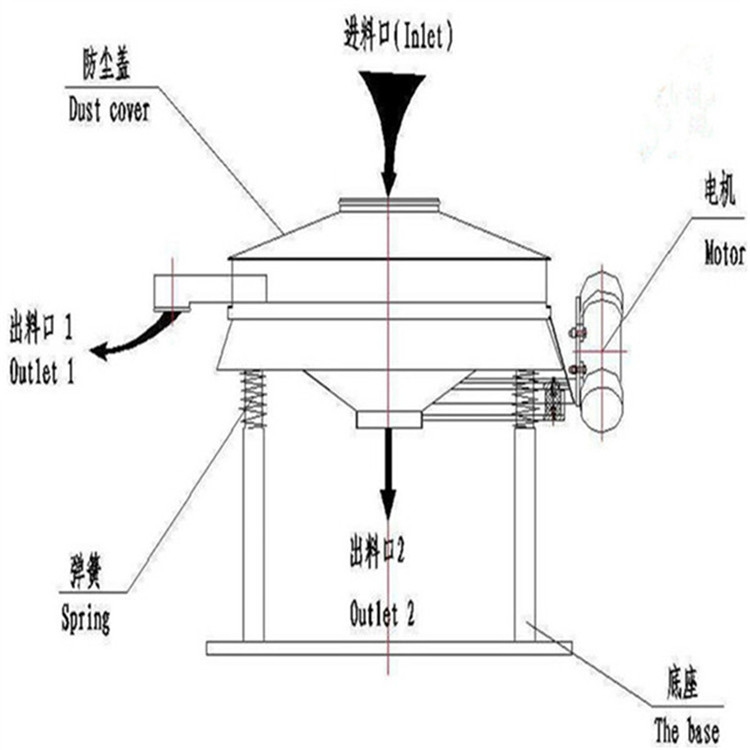 直排篩利用振動電機利用其軸上下端的兩組偏心塊(不平衡偏心塊)的相位角以及兩臺電機之間的交叉角度將振動電機的旋轉運動變為水平、垂直、傾斜以及離心作用的多作用力重疊,再將這種作用力傳遞給篩面,從而達到篩分的目的。改變上下偏心塊的相位角和重量,可以改變激振力的大小和物料的運動軌跡。