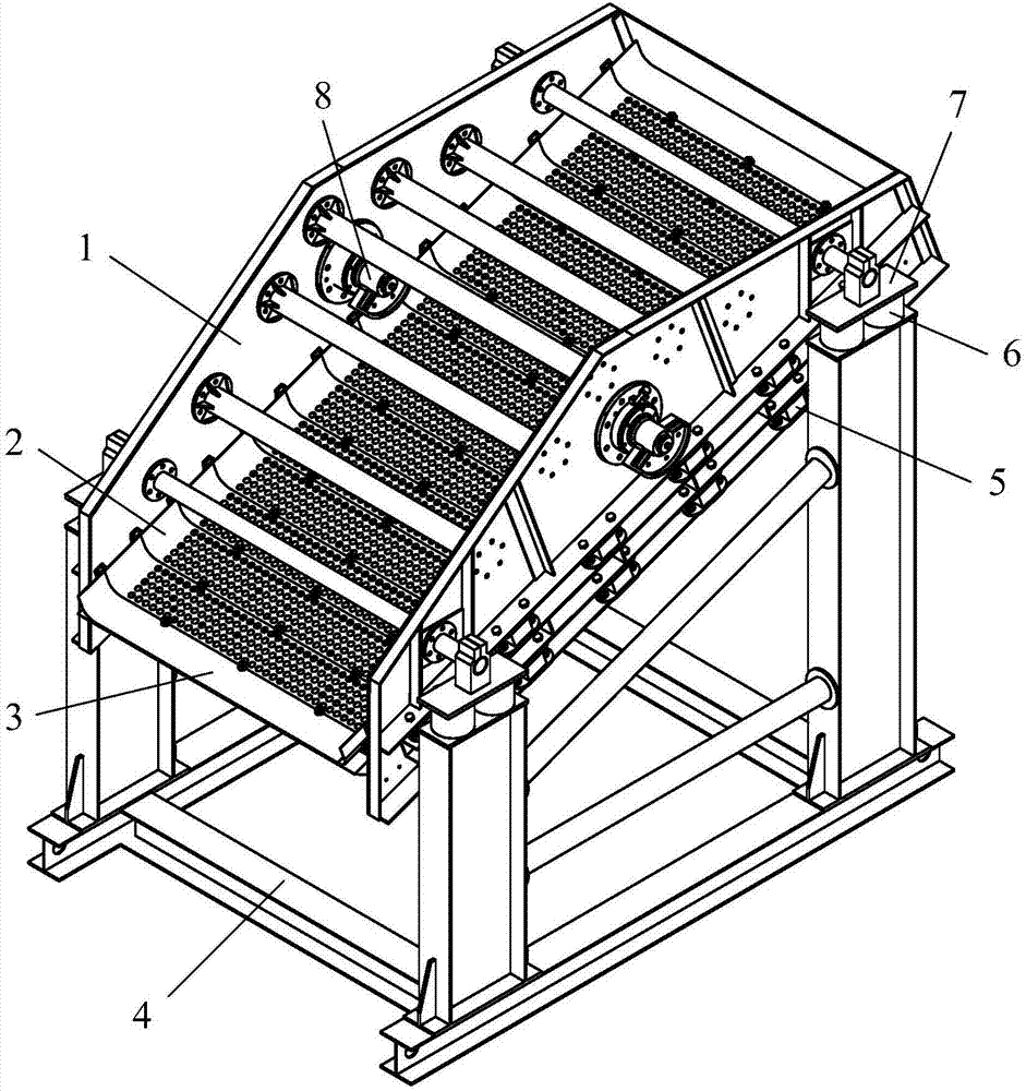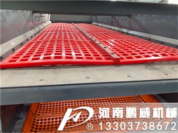 弛張篩是我廠生產(chǎn)的一種新型篩分機(jī)械。該機(jī)采用雙質(zhì)體亞共振原理,通過傾斜篩箱上安裝的彈性篩面的弛、張運(yùn)動拋擲物料的篩分機(jī)。其主要特點(diǎn)是篩分效率提高,處理量大,動負(fù)荷小,功耗少,噪聲低,因此應(yīng)用較為廣泛。在這個過程中,彈性聚氨酯篩面以每分鐘800次的頻率連續(xù)不斷地擴(kuò)張、收縮,從而獲得很高的加速度(50g),可處理6mm以下的粘性難篩分的物料,采用獨(dú)特的雙重振動原理,即通過共振幫助,使一個基本橢圓振動帶動了其他的一層或多層的浮床曲張,并且浮床曲張振動的振幅遠(yuǎn)大于傳統(tǒng)的振動設(shè)備的振幅,有效地防止了篩孔堵塞。弛張篩是雙質(zhì)量振動系統(tǒng),采用聚氨酚橡膠篩面,支承篩面的任意兩根相鄰橫梁都分別屬于兩個振動質(zhì)體,其中一個質(zhì)體是篩箱,另一個質(zhì)體是配重。在工作時,篩網(wǎng)交替地拉緊和松弛,使物料產(chǎn)生前進(jìn)彈跳運(yùn)動,可避免物料黏附篩網(wǎng)并堵塞篩孔。當(dāng)兩質(zhì)體相差二相位振動時,任意兩根相鄰橫梁時而靠近,時而遠(yuǎn)離,彈性篩面也相應(yīng)時而松弛,時而張緊,即篩面隨篩箱作牽連運(yùn)動的同時,還相對篩箱作相對運(yùn)動。這種弛張運(yùn)動不僅使篩孔不斷產(chǎn)生變形,而且大大增加了篩面的振動強(qiáng)度,從而有效地克服了篩孔堵塞現(xiàn)象,顯著提高了篩機(jī)處理能力。但是因篩箱的振動強(qiáng)度并不大,故機(jī)械強(qiáng)度容易保證,但篩面的振動強(qiáng)度較大且反復(fù)變形,故篩面壽命較低。根據(jù)料群運(yùn)動自身規(guī)律性,鵬威弛張篩可有效的使?jié)裾澄锪蠈铀缮ⅰ⒎謱雍屯负Y。